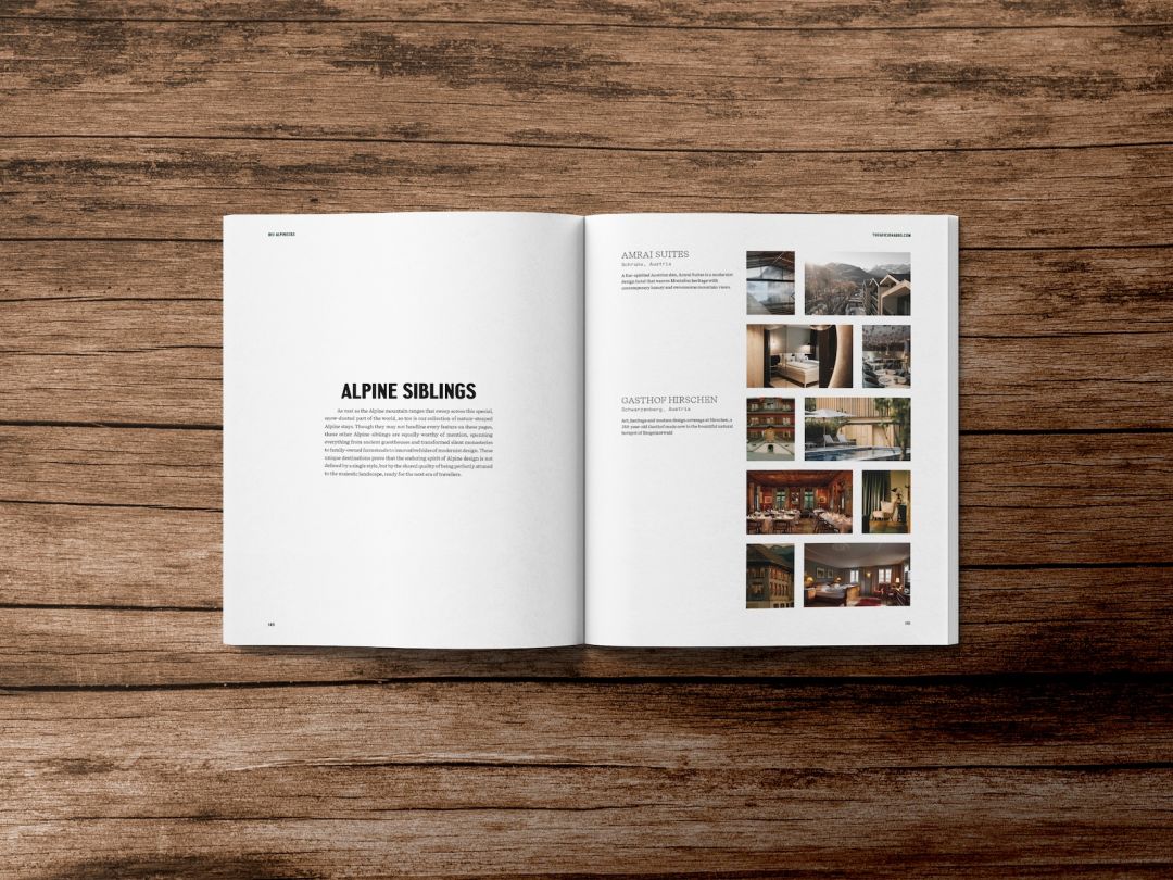 This design-led magazine curates 30 of the most distinctive Alpine hotels and cultural rendezvous for travellers drawn to interiors, architecture and individuality. Featuring more than 250 full-colour photographs, it explores the mountain landscape through a contemporary design lens, where place, material and restraint shape every decision.